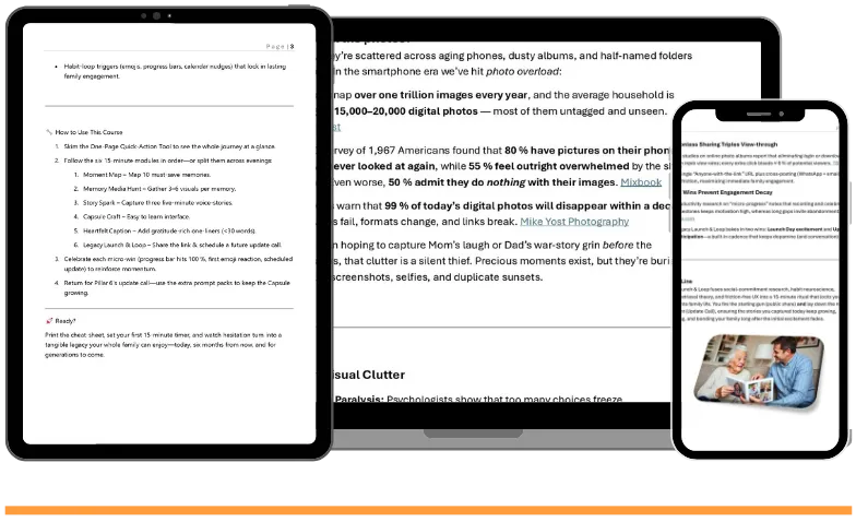 Conversation Rescue & Legacy Scripts. A 10-page bundle of emotional checklists, trust-repair prompts, and fill-in-the-blank scripts that take all the pressure off finding the right words. Turn awkward silences into meaningful conversations, and create legacy letters your parent will treasure forever.